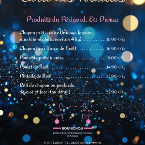Retrouvez chaque semaine nos produits de boucherie, colis de viande, plats cuisinés, kits recette à cuisiner à la maison… LIVRAISON GRATUITE sur un rayon de 25km autour de Saint-Cyprien (24220) du jeudi au samedi Ou RETRAIT DE VOTRE COMMANDE à la boucherie Bounichou à Saint-Cyprien du jeudi au dimanche de 9h à 12h30 (Les horaires sont susceptibles d’être modifiés et ajustés en fonction de vos besoins et vos commandes)